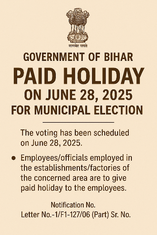 In a move to facilitate voter participation, the Government of Bihar has declared Saturday, June 28, 2025, as a paid holiday for employees working in establishments, factories, and other organizations situated within the jurisdiction of areas going to the Municipal General/Sub-Elections, 2025.